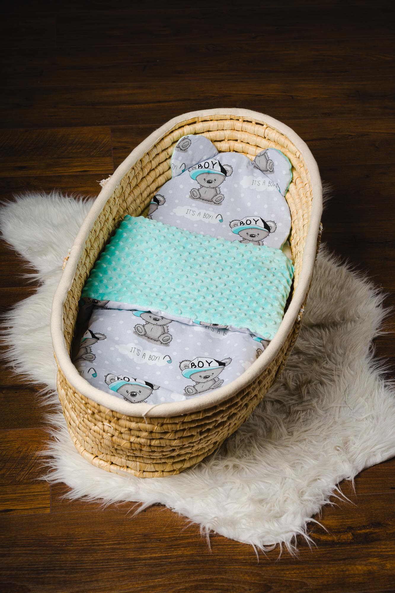 Kołderka: 75cm x 55 cm Poduszka: Miś