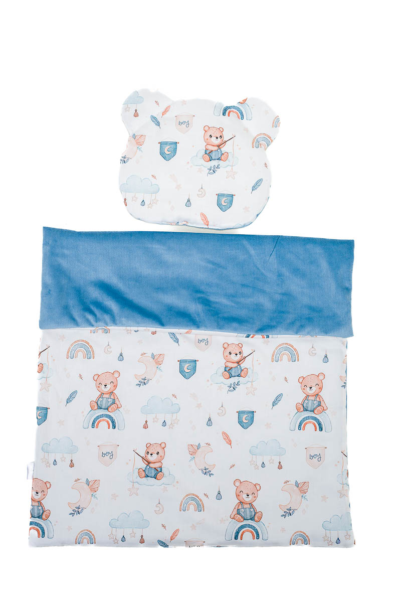Kołderka: 75cm x 55 cm Poduszka: Miś