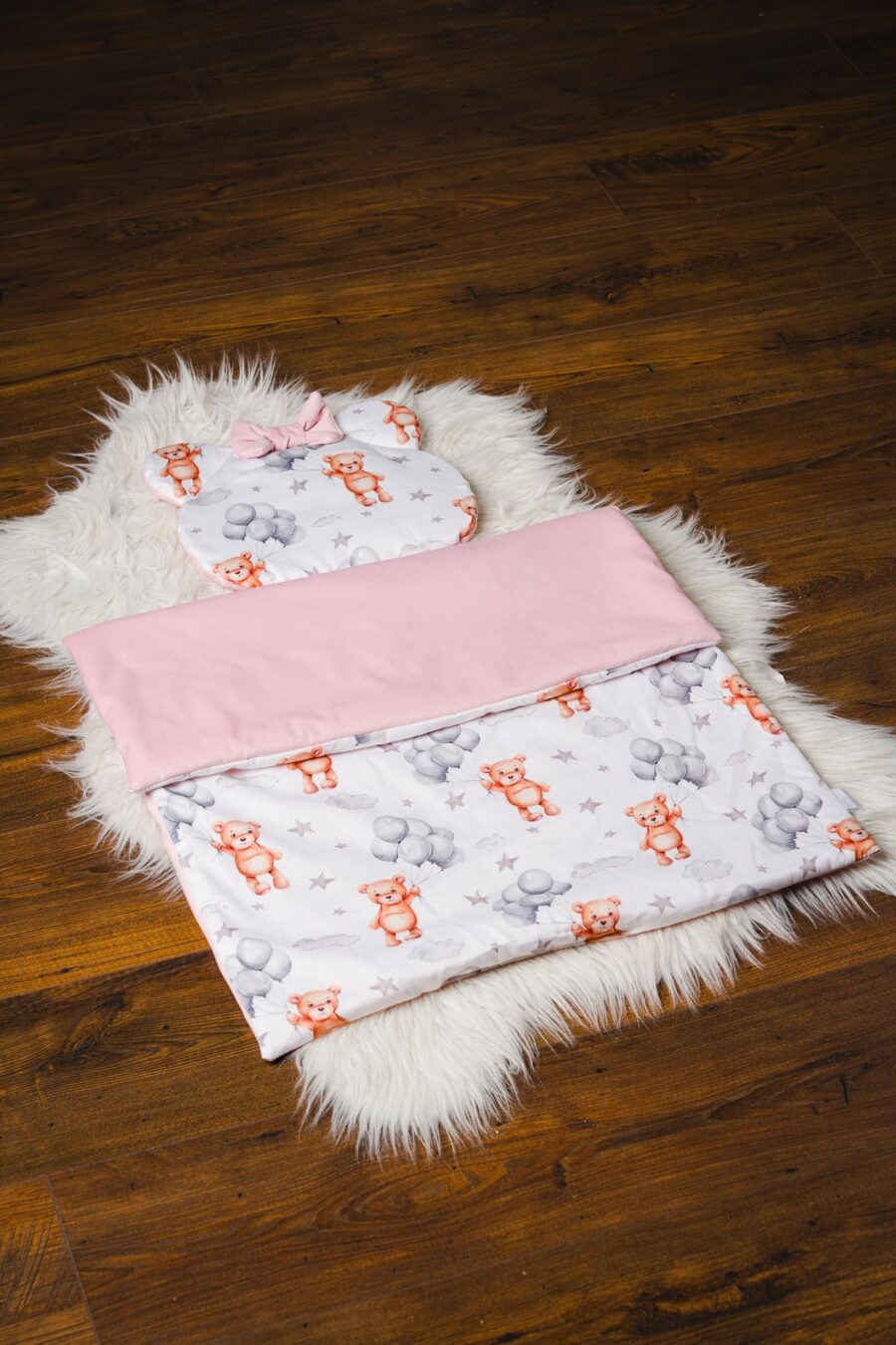 Kołderka: 75cm x 55 cm Poduszka: Miś
