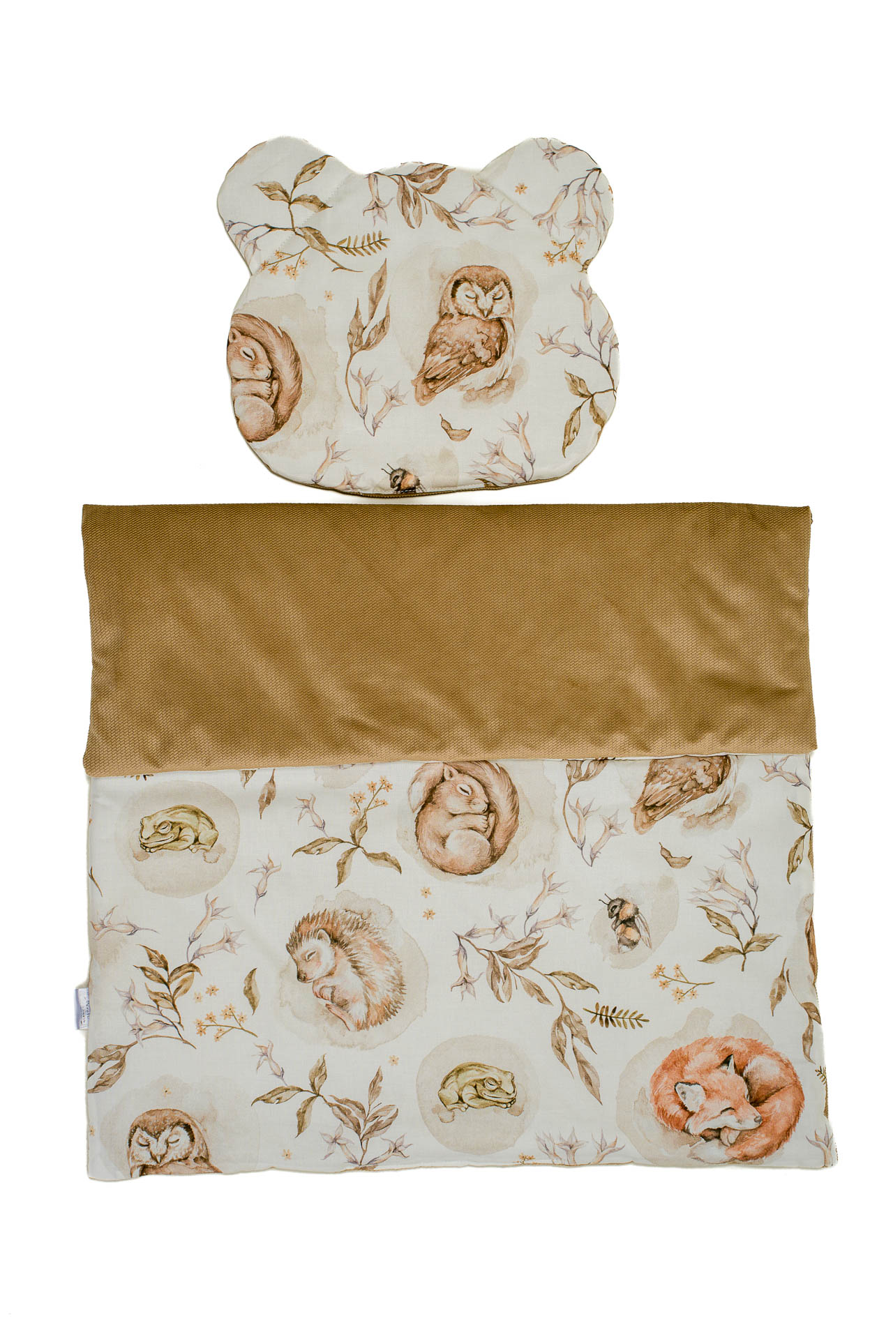 Kołderka: 75cm x 55 cm Poduszka: Miś