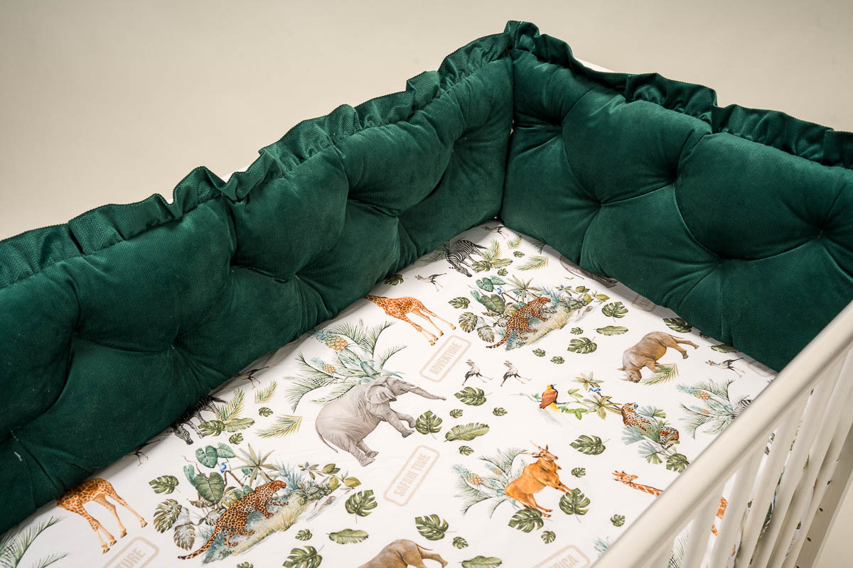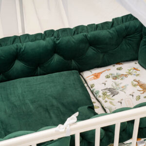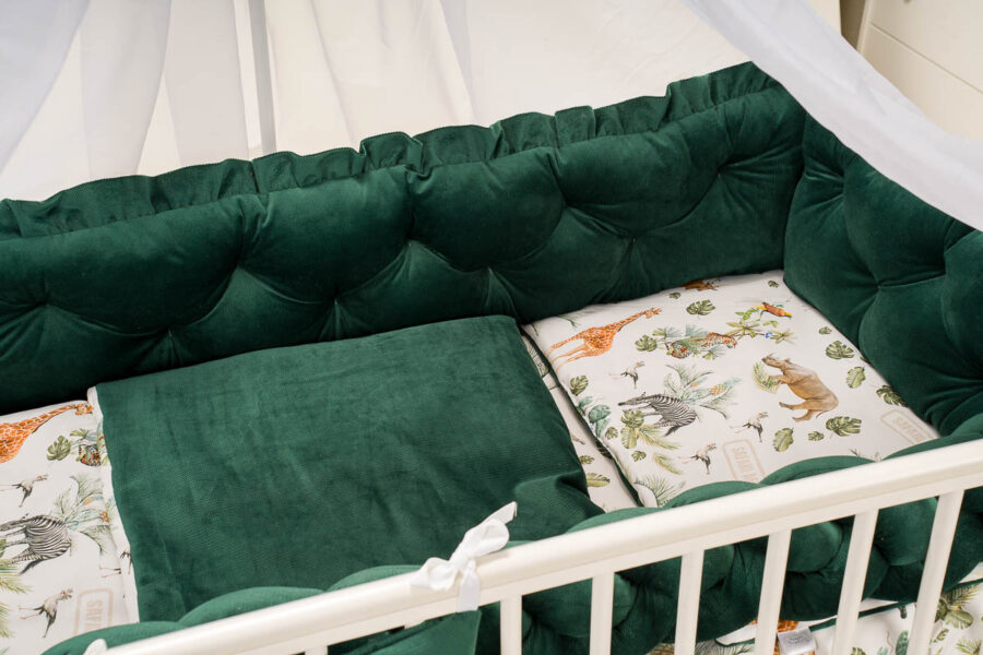 Płaski ochraniacz zapewnia bezpieczeństwo przed uderzeniem w szczebelki, zajmuje mało miejsca, dzięki czemu dziecko ma dużą swobodę w łóżeczku. Łatwo utrzymać go w czystości. Pięknie dekoruje dziecięcy pokój.