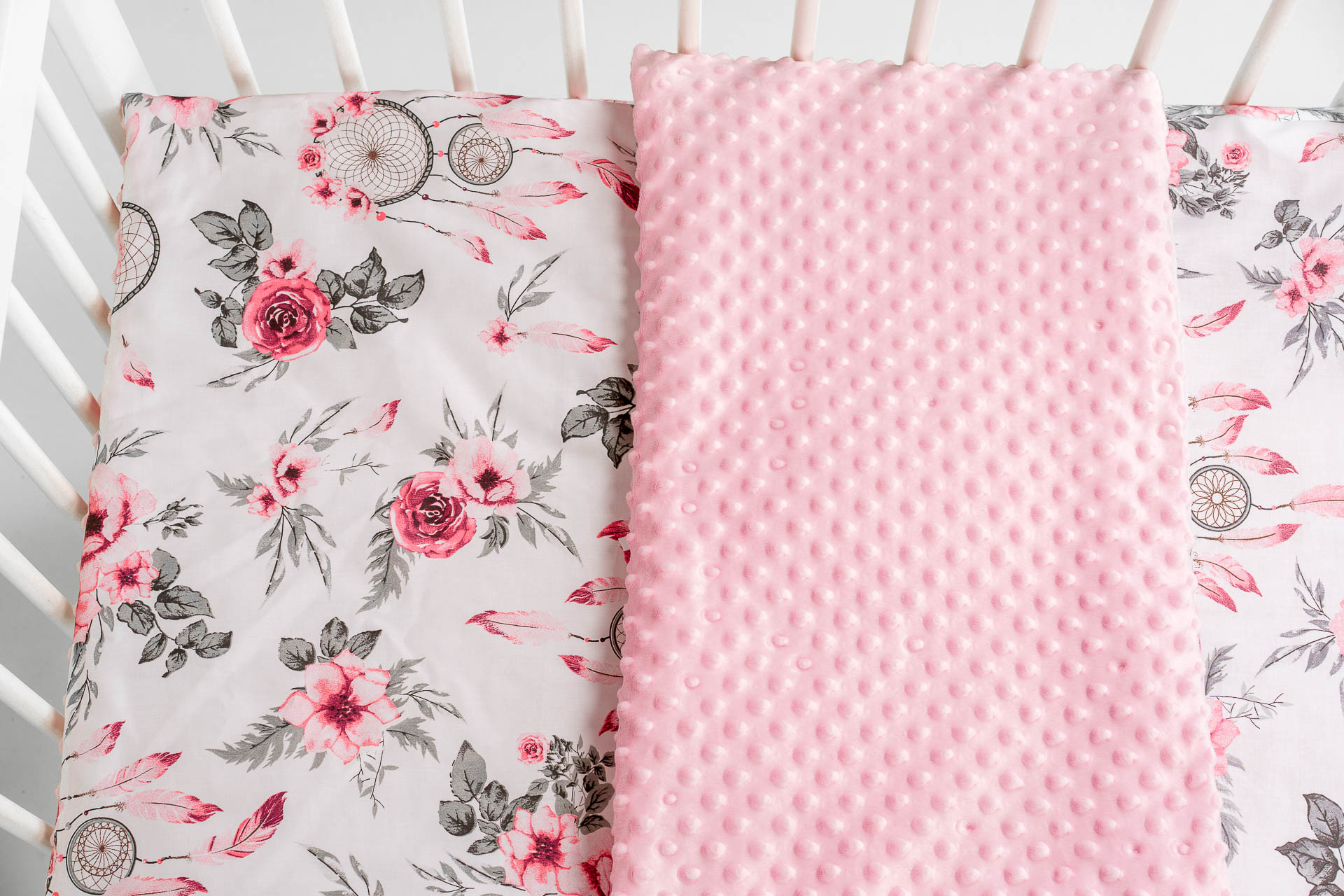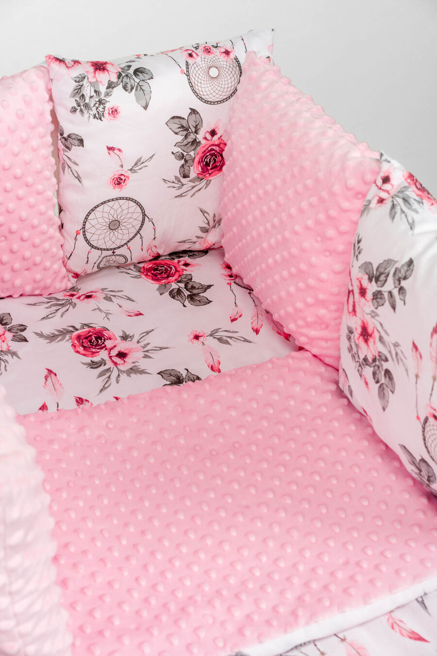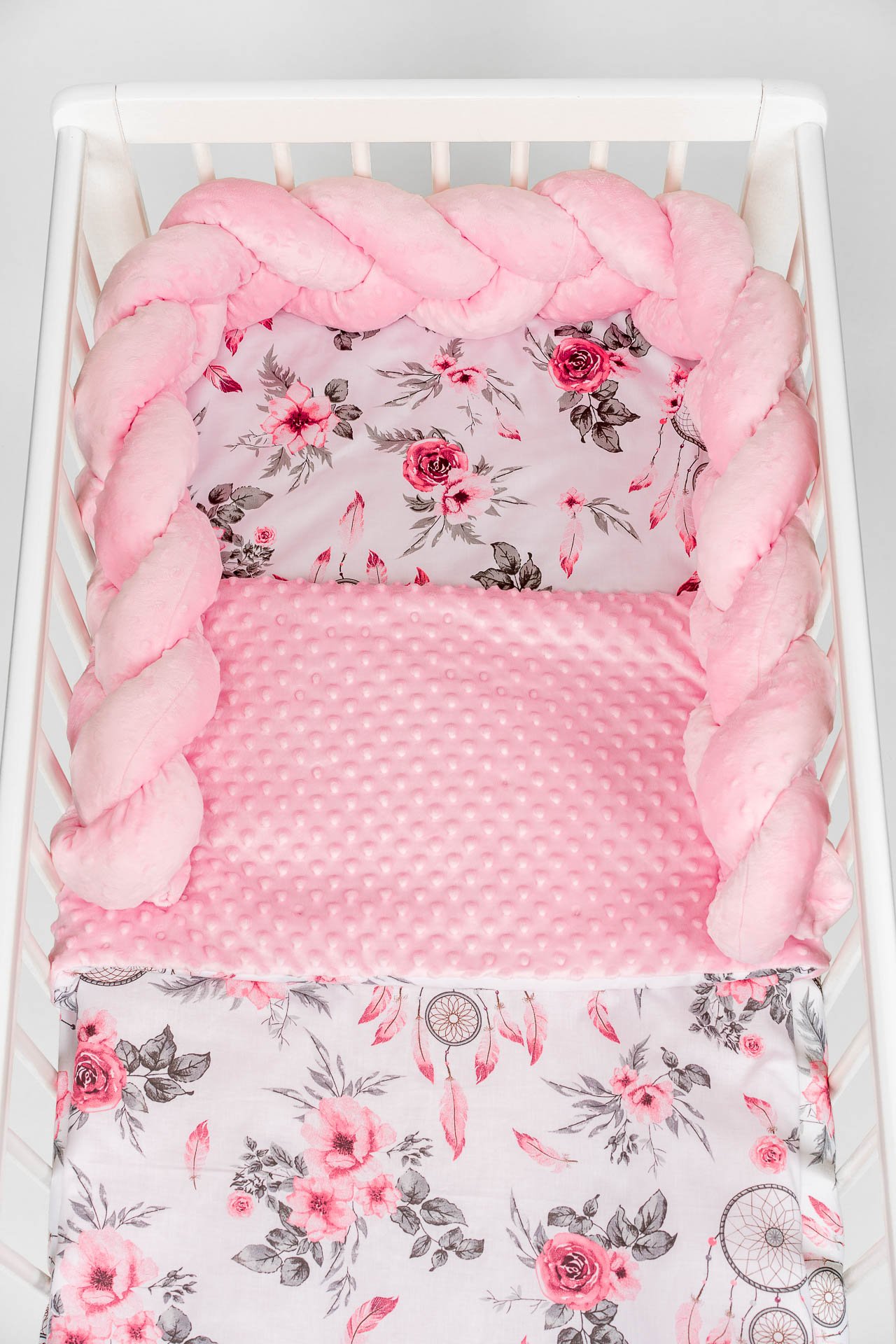 Zestaw do łóżeczka wykonany z Bawełny Premium i Velvetu to idealne połączenie dla maluszka. Ochraniacz do łóżeczka dodatkowo ochroni dziecko przed uderzeniem w szczebelki.