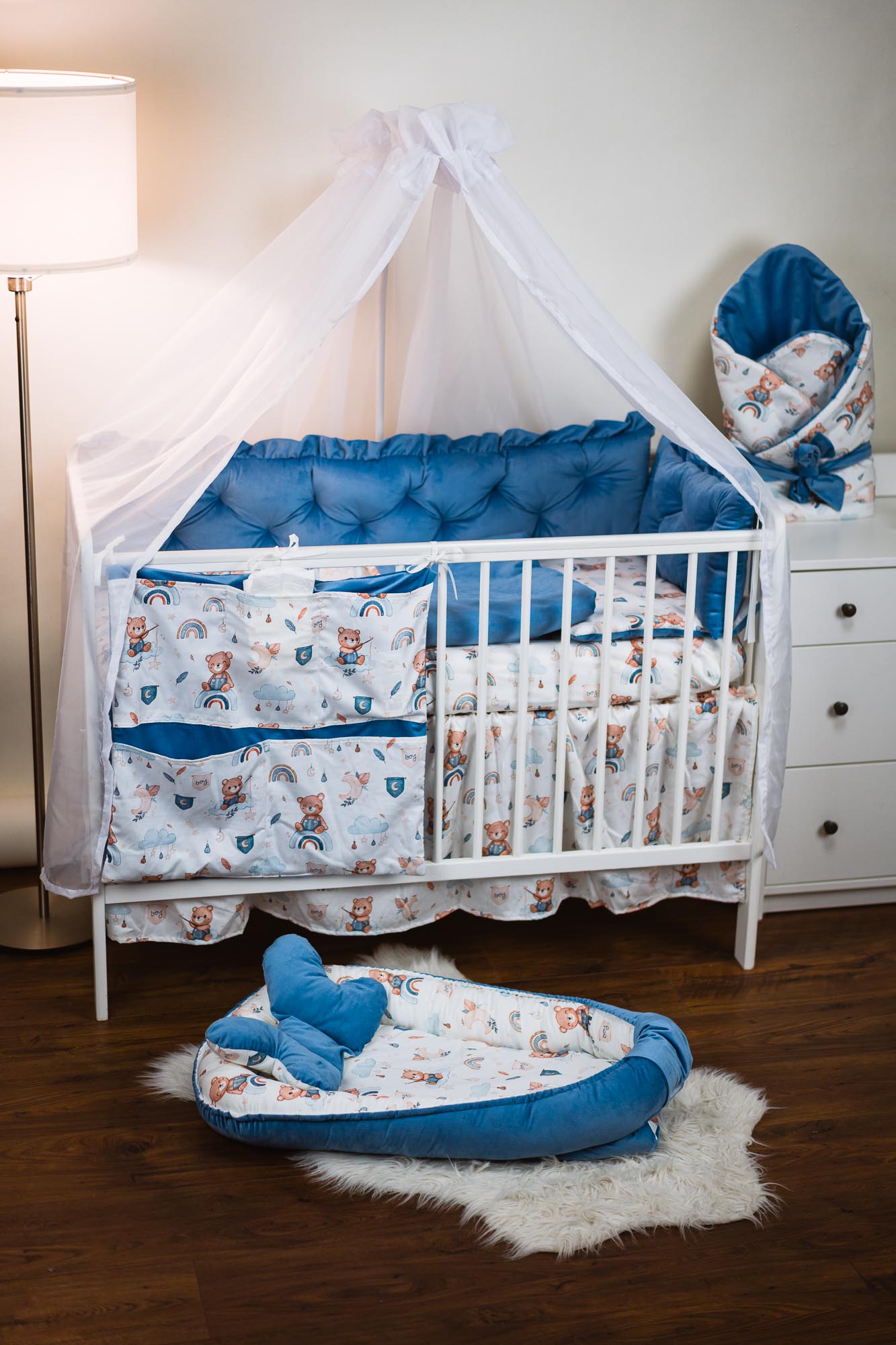 Zestaw do łóżeczka wykonany z Bawełny Premium i Velvetu to idealne połączenie dla maluszka. Ochraniacz do łóżeczka dodatkowo ochroni dziecko przed uderzeniem w szczebelki.
