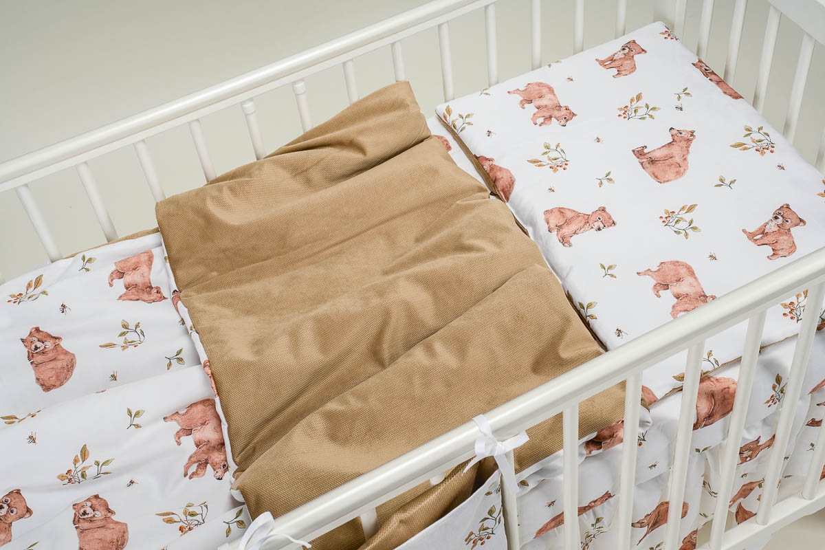 Zestaw do łóżeczka wykonany z Bawełny Premium i Velvetu to idealne połączenie dla maluszka. Ochraniacz do łóżeczka dodatkowo ochroni dziecko przed uderzeniem w szczebelki.